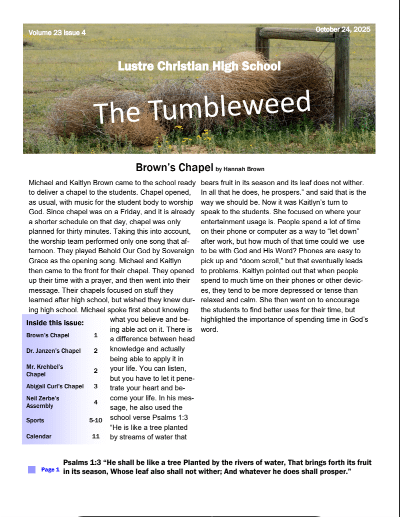 After facing a traumatic event in 2017, the Lord allowed me to find this Christian school. It certainly was His direction for us to encounter excellent teachers, wonderful dorm parents, and a great community of people in Lustre.
